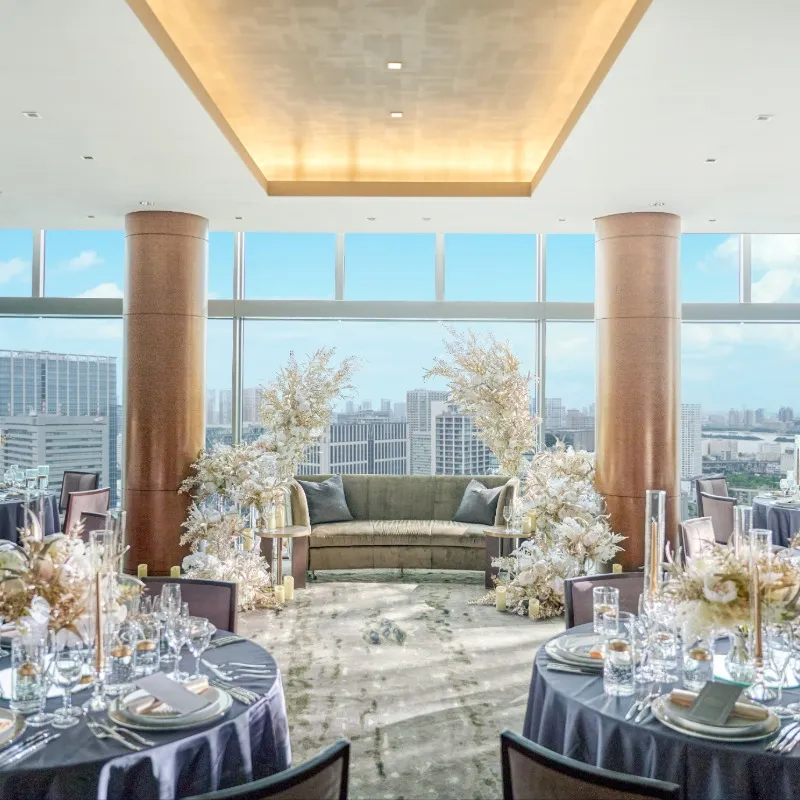 | 模擬披露宴 | 【絶景が広がる会場を体感】本番直前の会場を特別に開放。東京の絶景に彩られた上質なコーディネートや演出を堪能できます。ゲストを魅了する洗練されたおもてなしもご体感ください |